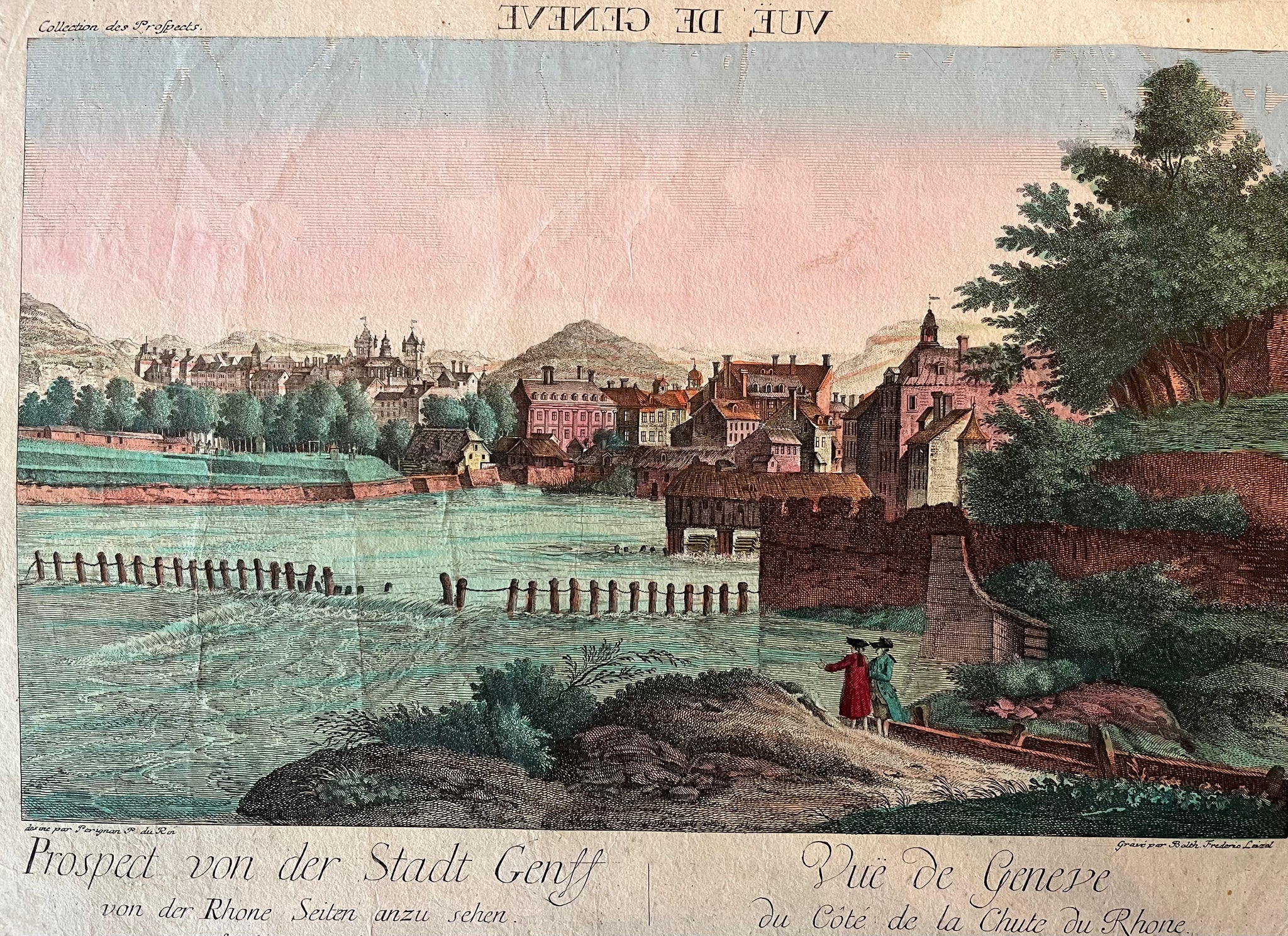 Title: ‘ Prospect von der Stadt Genff || Vue de Geneve du Cote de la Chute du Rhone’ . Nice view of Geneva from the river Rhone. Contemporary handcoloured engraving, so called optical prints (Guckkastenblat, Vue perspective, Vue d’ Optique) designed by Perignan, Published by Balthazar Frederic Leizel. Augsburg ca. 1760