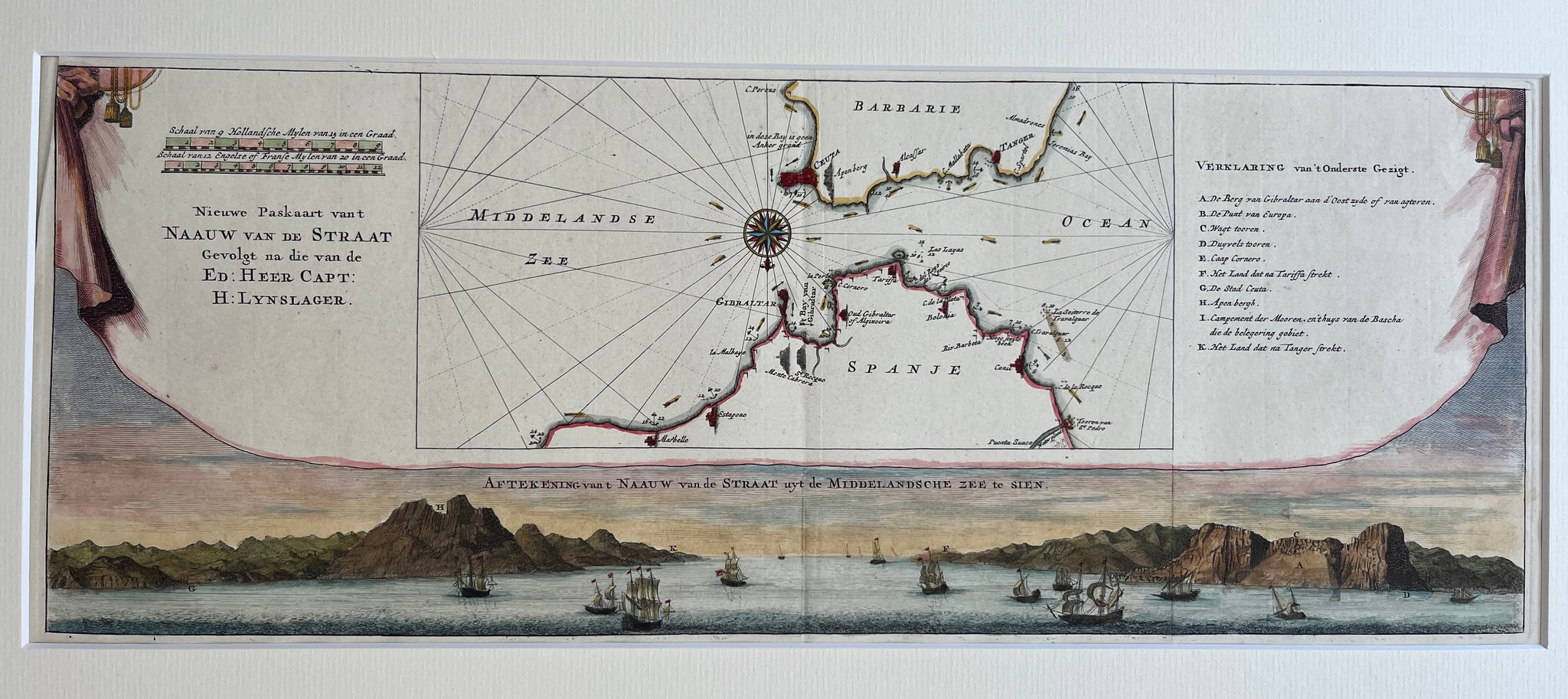 This finely detailed and beautifully hand-colored early 18th-century Dutch sea chart illustrates the Strait of Gibraltar—the vital maritime gateway between the Atlantic Ocean and the Mediterranean Sea. Titled “Nieuwe Paskaart van’t Naauw van de Straat”, this original copperplate engraving was published by Johannes Ratelband, a respected Amsterdam map and chart dealer of the period.