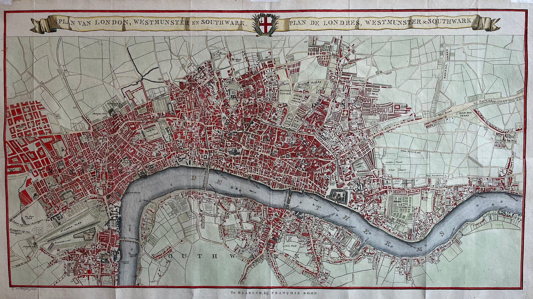 Large , rare map of London published in our hometown Haarlem by Francois Bohn. Handcoloured engraving by Cornelis Van Baarsel from ca. 1765. Very detailed plan, with names in English and Dutch ( ‘ Koninklijke weg naar Kensington’ , ‘ Brug van London’ , Black Fryers brug’ etc.).
